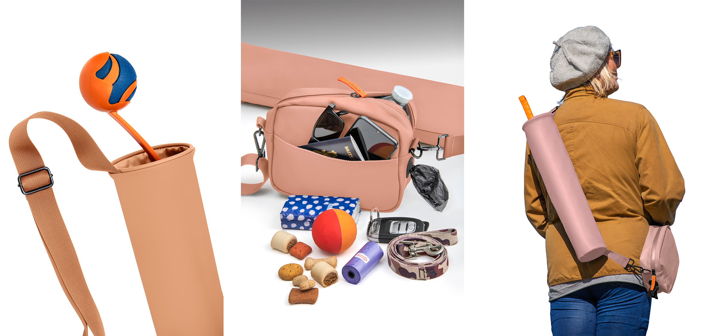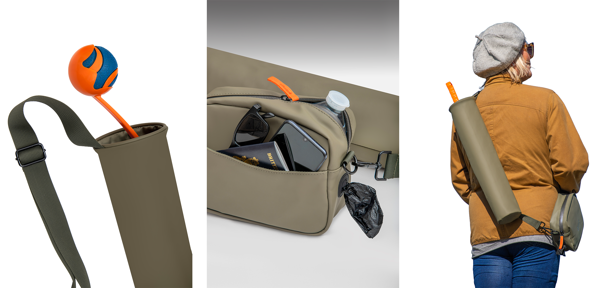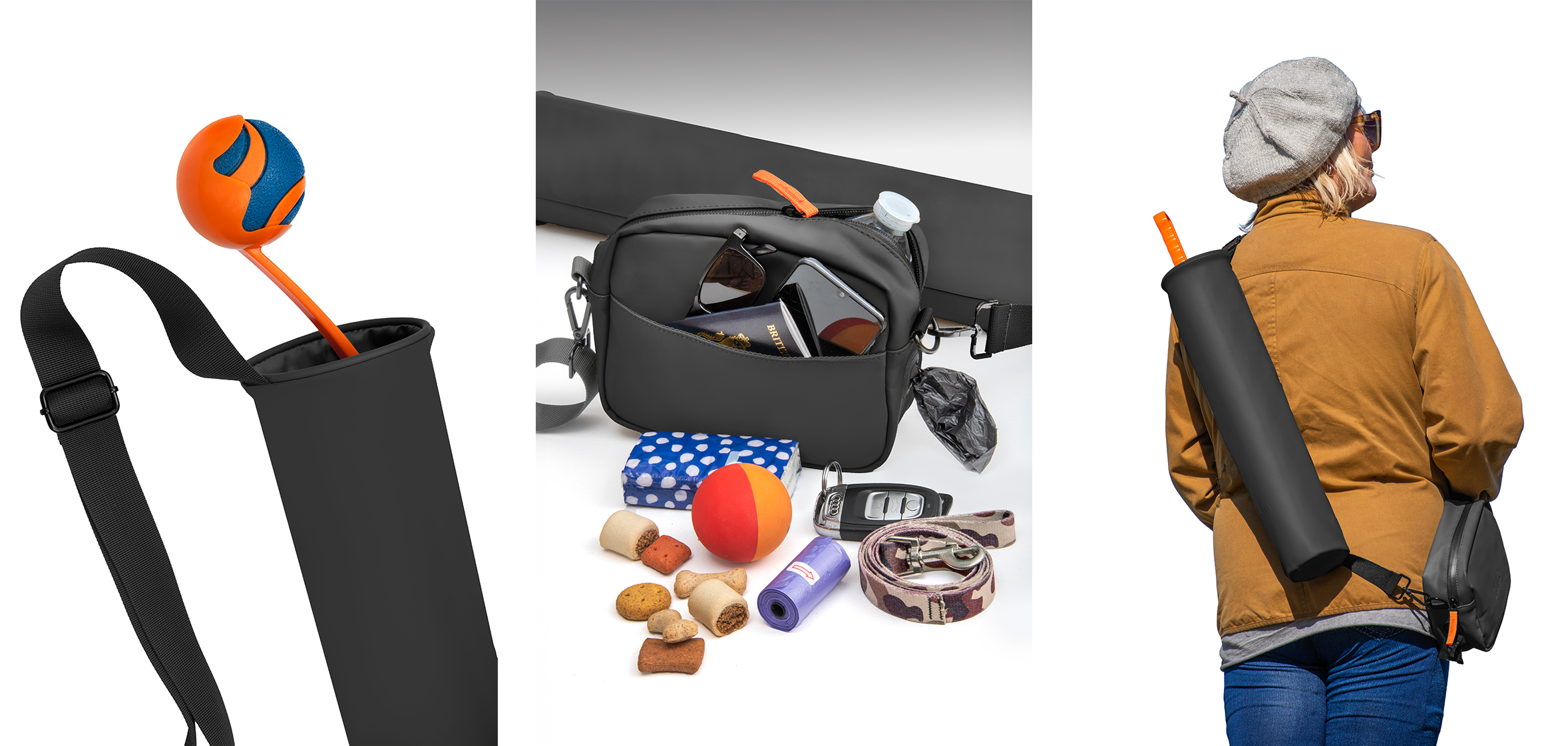 The QUIVR is a unisex, waterproof crossbody bag with a utilitarian design, built to carry everything you need for a dog walk—including that awkward ball launcher stick.